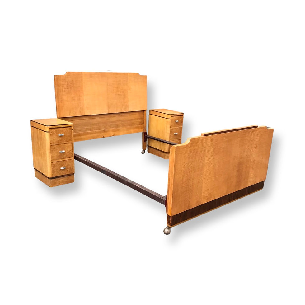 Art Deco Walnut Headboard and attached matching bedside cabinets